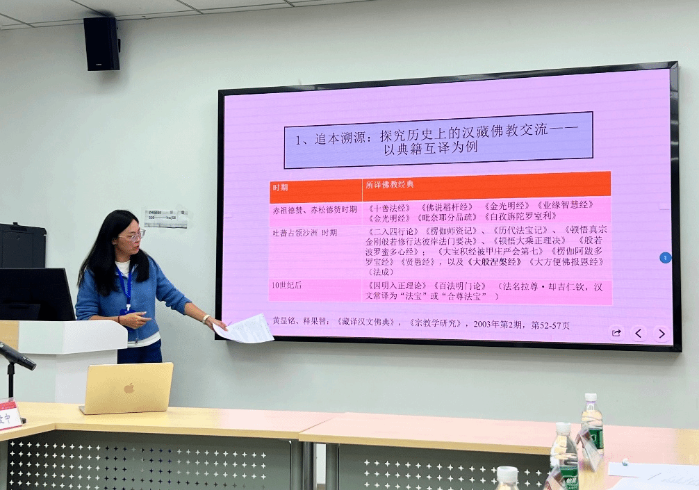 在交流研讨环节,庞玮副教授和石美老师分别以“铸牢中华民族共同体意识视角下的民族音乐文化认同——以藏语音乐传播为例”“中华文化视域下的汉藏佛学研究——论汉藏佛教的交流互鉴与中国化叙事之构建”为题进行主题发言。